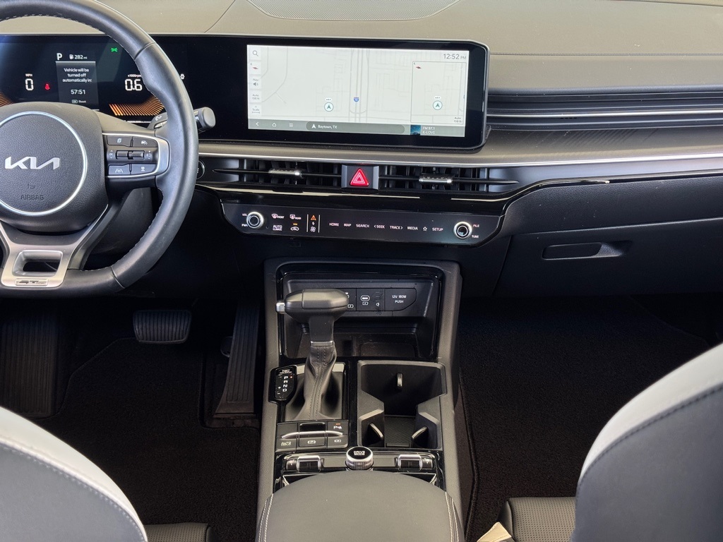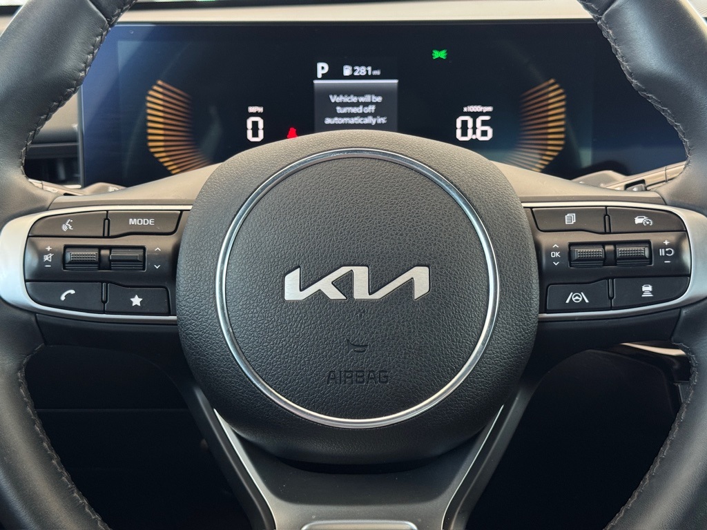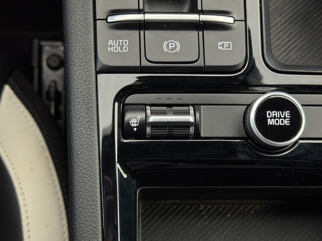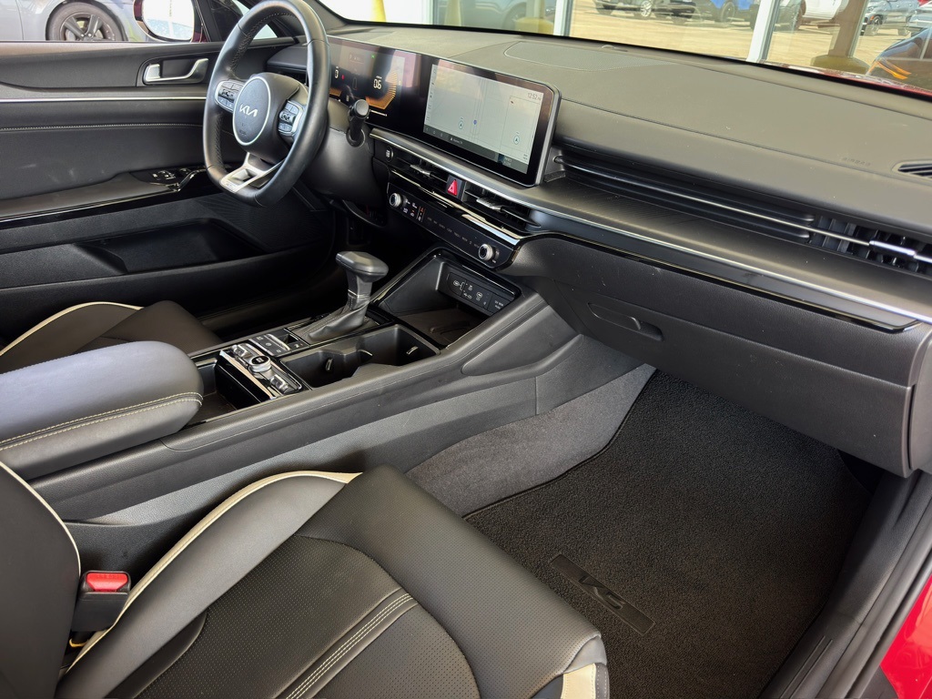 bility Control, Emergency communication system: Kia Connect (includes 1 year free trial), Four wheel independent suspension, Front anti-roll bar, Front Bucket Seats, Front Center Armrest, Front dual zone A/C, Front fog lights, Front reading lights, Fully automatic headlights, Heated door mirrors, Heated Front Bucket Seats, Heated front seats, Heated steering wheel, Illuminated entry, Knee airbag, Leather Shift Knob, Leather steering wheel, Low tire pressure warning, Navigation System, Occupant sensing airbag, Outside temperature display, Overhead airbag, Overhead console, Panic alarm, Passenger door bin, Passenger vanity mirror, Power door mirrors, Power driver seat, Power steering, Power windows, Radio data system, Radio: AM/FM Audio System, Rear anti-roll bar, Rear seat center armrest, Rear side impact airbag, Rear window defroster, Remote keyless entry, Security system, Speed control, Speed-sensing steering, Split folding rear seat, Sport steering wheel, Steering wheel mounted audio controls, Tachometer, Telescoping steering wheel, Tilt steering wheel, Traction control, Trip computer, Turn signal indicator mirrors, Variably intermittent wipers, Wheels: 18" x 7.5J Gloss Black Machined Finish Alloy.