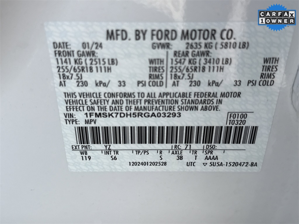 Equipment Group 202A (Heated ActiveX Captain's Chairs, Heated Steering Wheel, LED Fog Lamps, Remote Start System, and SecuriCode Keyless Entry Keypad), 4G LTE Wi-Fi Hotspot Credit, 6 Speakers, Air Conditioning, AM/FM radio: SiriusXM, AM/FM Stereo, Automatic temperature control, Bumpers: body-color, Compass, Driver door bin, Driver vanity mirror, FordPass Connect, Front dual zone A/C, Heated door mirrors, Panic alarm, Power door mirrors, Rear air conditioning, Rear Auxiliary Controls Credit, Rear window defroster, Security system, Speed control, Spoiler, SYNC 3 Communications & Entertainment System, 2nd Row 35/30/35 Bench w/E-Z Entry & Armrest, 3.58 Non-Limited-Slip Rear Axle Ratio, 3rd row seats: bench, 4-Wheel Disc Brakes, ABS brakes, Alloy wheels, Auto High-beam Headlights, Brake assist, Delay-off headlights, Dual front impact airbags, Dual front side impact airbags, Electronic Stability Control, Emergency communication system: SYNC 3 911 Assist, Exterior Parking Camera Rear, Four wheel independent suspension, Front anti-roll bar, Front Bucket Seats, Front Center Armrest, Front reading lights, Fully automatic headlights, Heated front seats, Heated Unique Cloth Captain's Chairs, Illuminated entry, Knee airbag, Leather steering wheel, Low tire pressure warning, Occupant sensing airbag, Outside temperature display, Overhead airbag, Overhead console, Passenger door bin, Passenger vanity mirror, Power driver seat, Power Liftgate, Power passenger seat, Power steering, Power windows, Rear anti-roll bar, Rear reading lights, Rear window wiper, Remote keyless entry, Speed-sensing steering, Speed-Sensitive Wipers, Split folding rear seat, Steering wheel mounted audio controls, SYNC 3/Apple CarPlay/Android Auto, Tachometer, Telescoping steering wheel, Tilt steering wheel, Traction control, Trip computer, Variably intermittent wipers, and Wheels: 18" 5-Spoke Silver-Painted Aluminum.