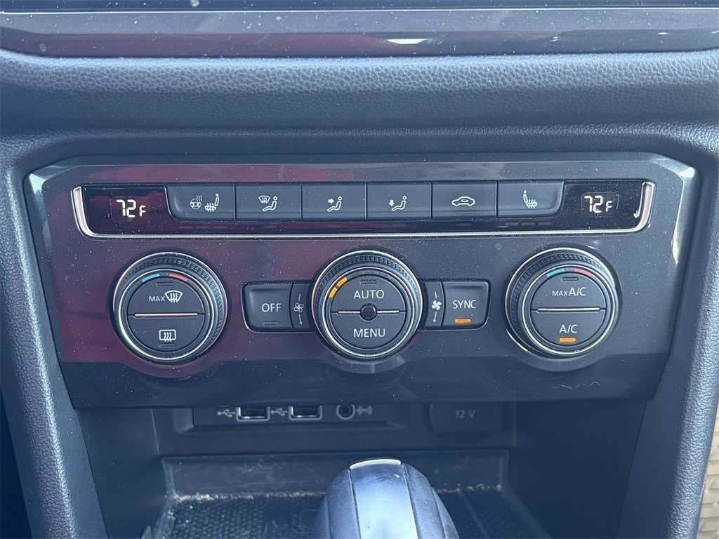 tic temperature control, Brake assist, Bumpers: body-color, Compass, Delay-off headlights, Driver door bin, Driver vanity mirror, Dual front impact airbags, Dual front side impact airbags, Electronic Stability Control, Emergency communication system: VW Car-Net services (capabilities require enrollment or subscription), Exterior Parking Camera Rear, Forward collision: FCW w/Autonomous Emergency Braking mitigation, Four wheel independent suspension, Frameless Auto-Dimming Rearview Mirror, Front anti-roll bar, Front Bucket Seats, Front Center Armrest, Front dual zone A/C, Front fog lights, Front reading lights, Fully automatic headlights, Heated door mirrors, Heated Front Comfort Seats, Heated front seats, Heated steering wheel, Heavy Duty Trunk Liner w/VW CarGo Blocks, Illuminated entry, Lane Departure Warning System, Leather Shift Knob, Low tire pressure warning, Navigation system: VW Car-Net Guide & Inform, Occupant sensing airbag, Outside temperature display, Overhead airbag, Overhead console, Panic alarm, Passenger door bin, Passenger vanity mirror, Perforated V-Tex Leatherette Seating Surfaces, Power door mirrors, Power driver seat, Power Liftgate, Power moonroof, Power steering, Power windows, Radio data system, Radio: Discover Media AM/FM/HD, Rain sensing wipers, Rear anti-roll bar, Rear reading lights, Rear seat center armrest, Rear window defroster, Rear window wiper, Remote keyless entry, Roof rack: rails only, Security system, Speed control, Speed-sensing steering, Split folding rear seat, Spoiler, Steering wheel mounted audio controls, Tachometer, Telescoping steering wheel, Tilt steering wheel, Traction control, Trip computer, Turn signal indicator mirrors, Variably intermittent wipers, VW App-Connect (w/Apple CarPlay, Android Auto & MirrorLink), and Wheels: 19" 5-Spoke Gray Alloy.