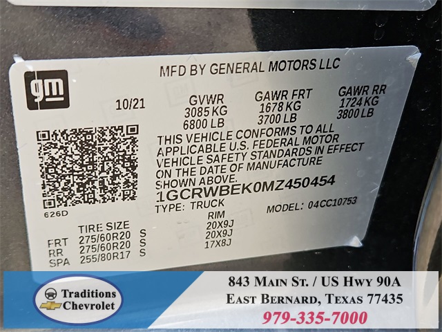 d SiriusXM Radio), Preferred Equipment Group 1CX (170 Amp Alternator, 3.5" Diagonal Monochromatic Display, Bluetooth® For Phone, Body Color Grille, Color-Keyed Carpeting Floor Covering, Compass, Deep-Tinted Glass, Electronic Cruise Control, Front Frame-Mounted Black Recovery Hooks, Front Rubberized Vinyl Floor Mats, Manual Tilt Wheel Steering Column, Power Door Locks, Power Front Windows w/Driver Express Up/Down, Power Front Windows w/Passenger Express Down, Power Rear Windows w/Express Down, Rear 60/40 Folding Bench Seat (Folds Up), Rear Rubberized-Vinyl Floor Mats, Remote Keyless Entry, and Standard Tailgate), Trailering Package (Hitch Guidance), CARBRAVO CERTIFIED Certified, 8-Speed Automatic, Black Cloth, 120-Volt Bed Mounted Power Outlet, 120-Volt Instrument Panel Power Outlet, 3.42 Rear Axle Ratio, 4-Wheel Disc Brakes, 40/20/40 Front Split Bench Seat, 6 Speakers, ABS brakes, Air Conditioning, Alloy wheels, AM/FM radio: SiriusXM, Apple CarPlay/Android Auto, Auto-Locking Rear Differential, Brake assist, Bumpers: body-color, Cloth Seat Trim, Delay-off headlights, Driver door bin, Driver vanity mirror, Dual front impact airbags, Dual front side impact airbags, Electronic Stability Control, Front anti-roll bar, Front Center Armrest w/Storage, Front License Plate Kit, Front reading lights, Front wheel independent suspension, Fully automatic headlights, Heated door mirrors, Heavy Duty Suspension, Illuminated entry, Low tire pressure warning, Occupant sensing airbag, Outside temperature display, Overhead airbag, Overhead console, Panic alarm, Passenger door bin, Passenger vanity mirror, Polished Exhaust Tip, Power door mirrors, Power steering, Power windows, Premium audio system: Chevrolet Infotainment 3, Radio data system, Radio: Chevrolet Infotainment 3 System, Rear reading lights, Rear step bumper, Rear window defroster, Remote keyless entry, Security system, Single-Zone Manual/Semi-Automatic Air Conditioning, Speed control, Speed-sensing steering, Split folding rear seat, Tachometer, Tilt steering wheel, Traction control, Trip computer, Variably intermittent wipers, Voltmeter, and Wheels: 20" x 9" Bright Silver Painted Aluminum. Certification Program Details: CARBRAVO CERTIFIED