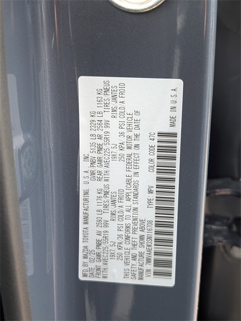 Wheel Locks, Brake assist, Bumpers: body-color, Delay-off headlights, Driver door bin, Driver vanity mirror, Dual front impact airbags, Dual front side impact airbags, Electronic Stability Control, Emergency communication system: MAZDA CONNECT, Exterior Parking Camera Rear, Front anti-roll bar, Front Bucket Seats, Front Center Armrest, Front dual zone A/C, Front reading lights, Front wheel independent suspension, Fully automatic headlights, Garage door transmitter: HomeLink, Heads-Up Display, Heated and Ventilated Front Seats with 3 Level Adjustment, Heated door mirrors, Heated front seats, Illuminated entry, Knee airbag, Leather Seat Trim, Leather Shift Knob, Leather steering wheel, Low tire pressure warning, Memory seat, Occupant sensing airbag, Outside temperature display, Overhead airbag, Overhead console, Panic alarm, Passenger door bin, Passenger vanity mirror, Polymetal Gray Metallic Paint Charge, Power door mirrors, Power driver seat, Power Liftgate, Power moonroof, Power passenger seat, Power steering, Power windows, Radio data system, Radio: AM/FM/HD Bose 12-Speaker Audio Sound System, Rain sensing wipers, Rear seat center armrest, Rear window defroster, Rear window wiper, Remote keyless entry, Speed control, Speed-sensing steering, Split folding rear seat, Spoiler, Steering wheel mounted audio controls, Tachometer, Telescoping steering wheel, Tilt steering wheel, Traction control, Trip computer, Turn signal indicator mirrors, Variably intermittent wipers, Ventilated front seats, and Wheels: 19" x 7.5J Aluminum Alloy Black Metallic with Machine Cut. 2025 Polymetal Gray Metallic Mazda CX-50 Hybrid Premium Plus 4D Sport Utility AWD 2.5L 4-Cylinder eCVT Pricing is subject to change without prior notice. Not all forms of payment are accepted. Residency restrictions apply. See dealer for complete details. Price includes: $1000 - Customer Cash. Exp. 01/02/2026